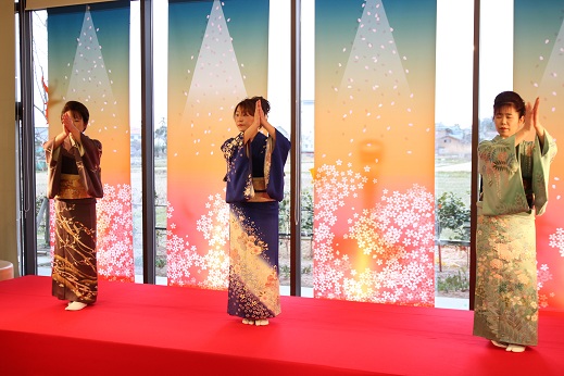 学生が作った舞台に岩室芸妓。春めいたバックグラウンドの幕が芸妓さんの着物に見事にマッチしてますね~。